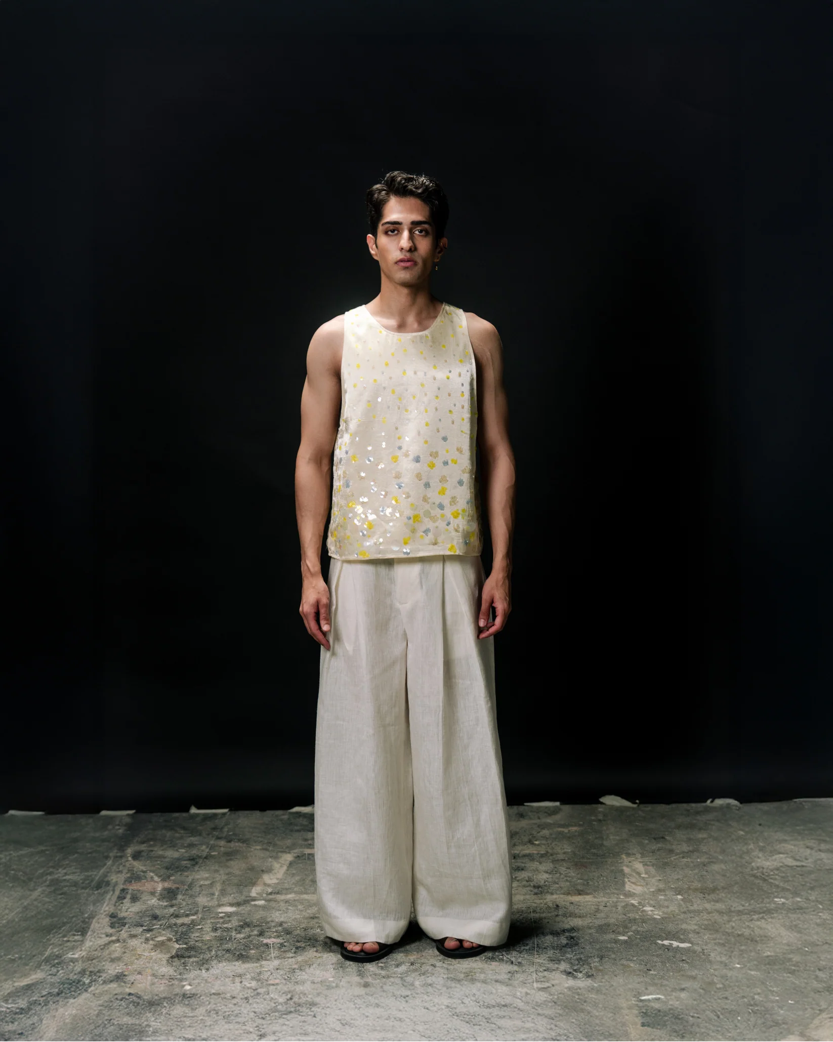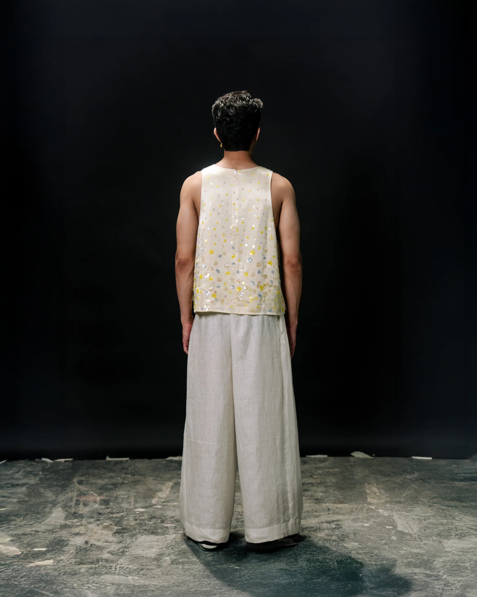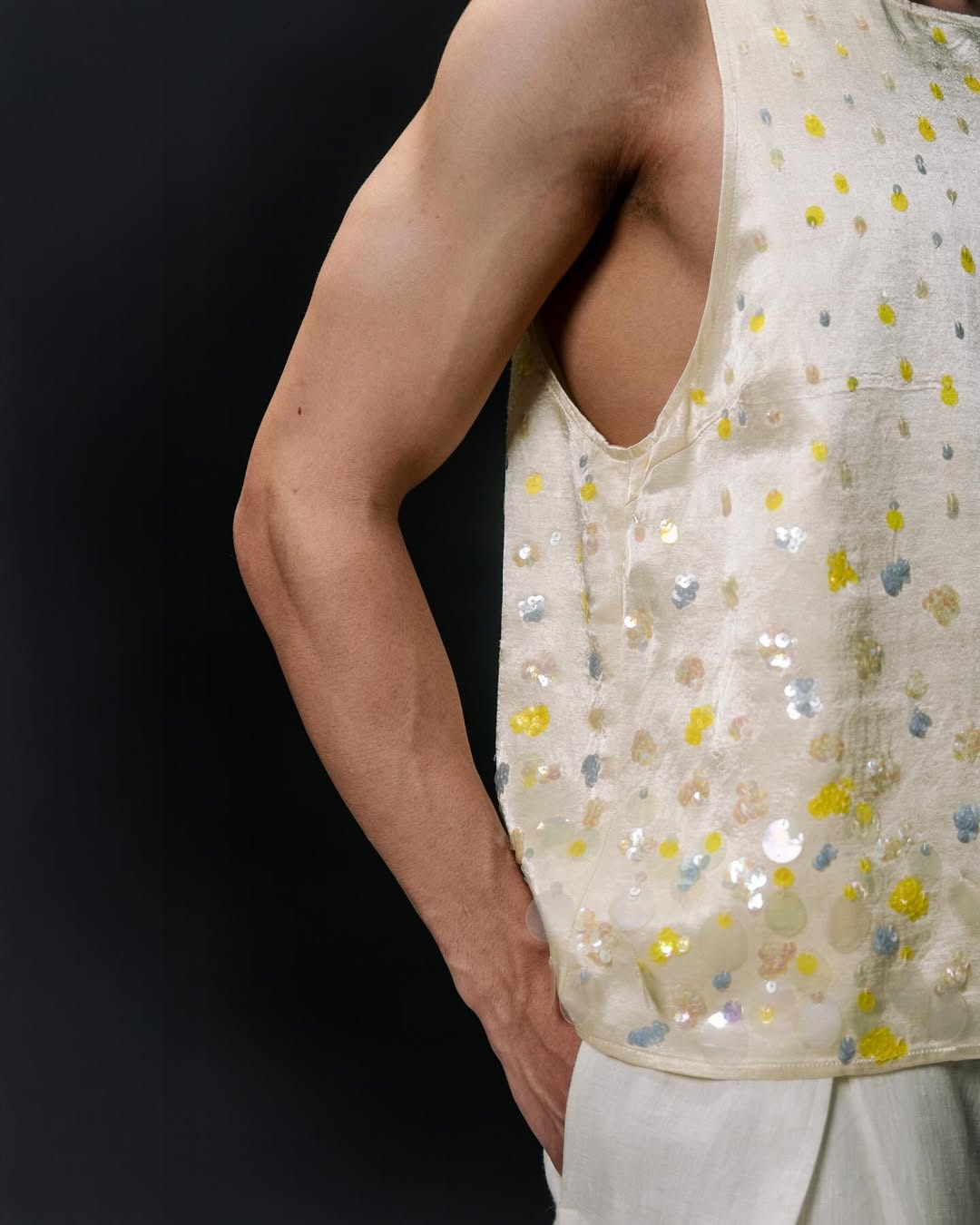 Relaxed, sleeve-less tank top with hand-embroidered sequins of varying colours & sizes.