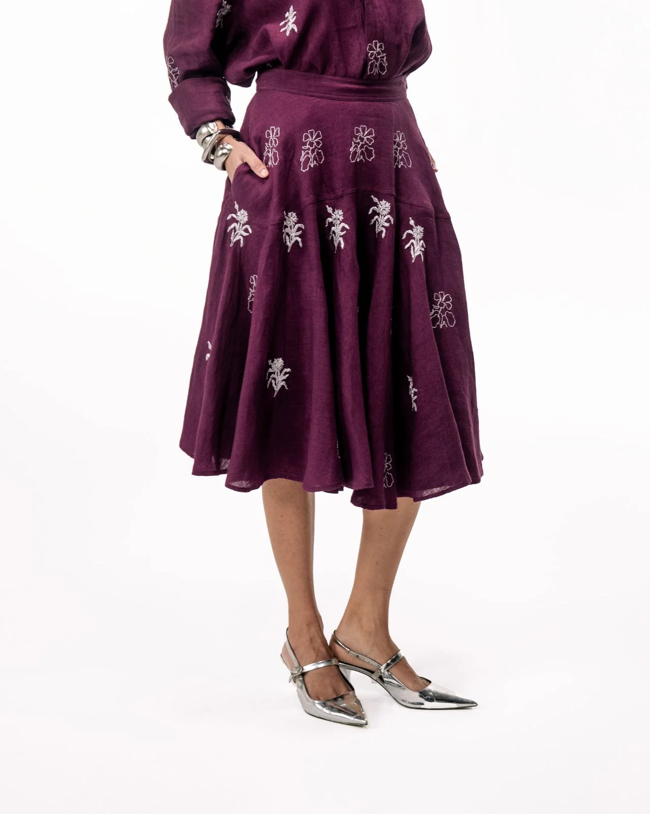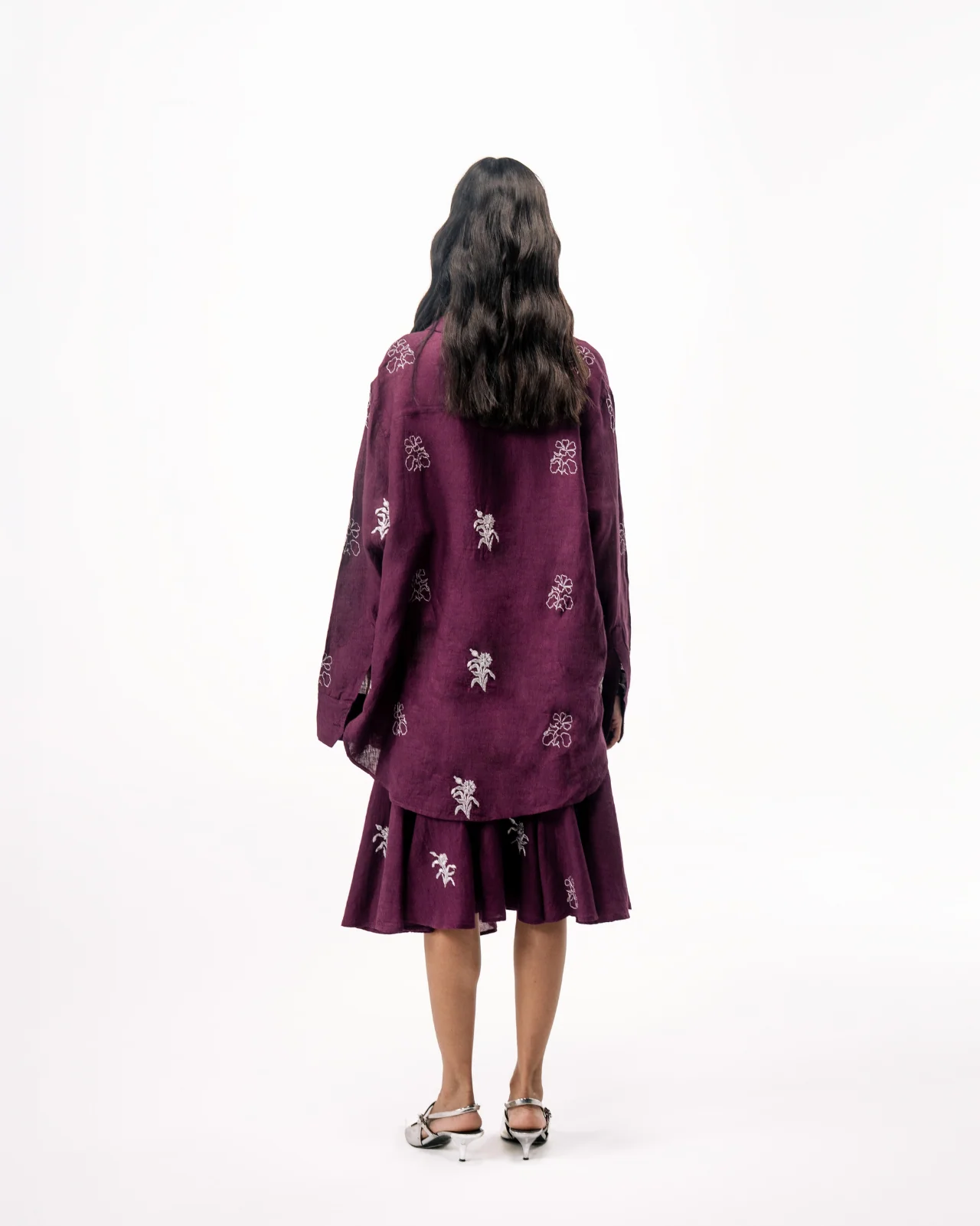 A relaxed set of a drop-waist skirt, cut on bias and an oversized button down.Adorned with hand-embroidered abstract floral motifs, in silver Zari.